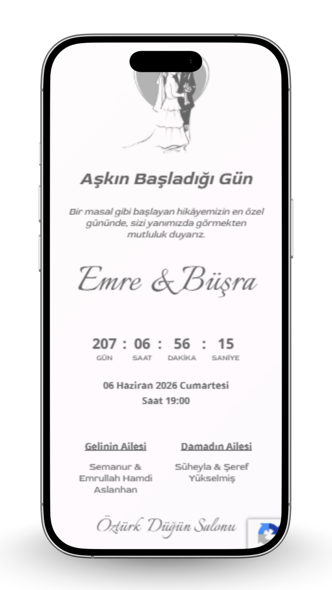 Nikah, Kına, Gelin alma bilgileri, sevdiklerinize mesajlarınız, gelin ve damat yorumları gibi tüm detayları sizin için davetiyenize ekleyebiliriz.